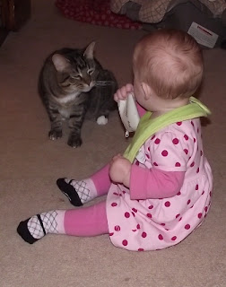 Marigold and my friend's cat not quite trusting one another.... but thinking about it.