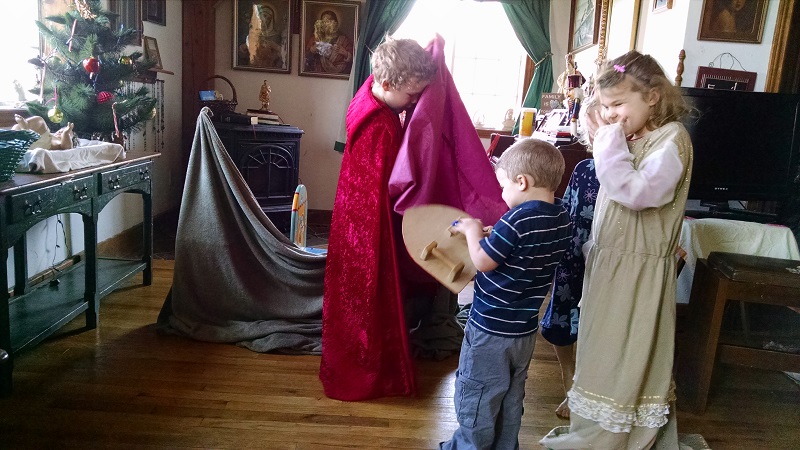 Then we had a week of ice, snow, rain, and play practices for the play which was on Friday, January 13th... photos to come soon....In the meantime at home, the littles put on some plays. This is the scene with the White Witch in Narnia. Please note that no one was hurt as Kili drove the bears with a belt! And Bilbo did not mind.