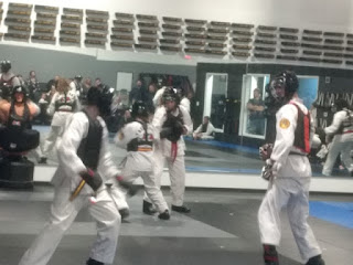 Intermediate and advanced color belts do forms, weapons (nun-chucks), sparring, and fit test