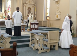 We had 10 beautiful bouquets to decorate the church. 2 on the High Altar, 1 on each of the 2 side Altars (Blessed Mother and St. Joseph), 1 at the Sacred Heart, 1 at the Immaculate Heart, 1 at St. Michael, 1 at the Infant of Prague, and 2 in front of the temporary statue of Our Lady of Fatima.
